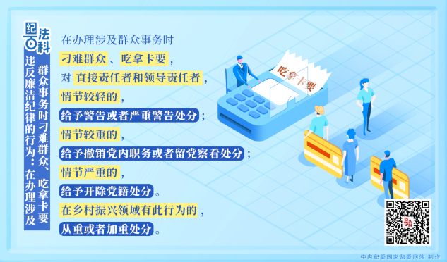 《中国共产党纪律处分条例》第一百二十二条规定,在办理涉及群众事务时刁难群众、吃拿卡要,对直接责任者和领导责任者,情节较轻的,给予警告或者严重警告处分;情节较重的,给予撤销党内职务或者留党察看处分;情节严重的,给予开除党籍处分。