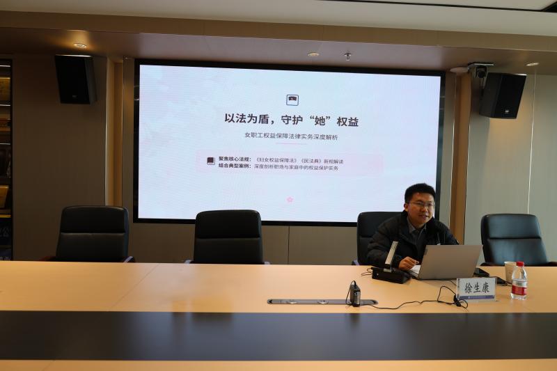 普法环节特邀合作单位律师事务所徐律师作专题讲座。讲座紧扣女职工关切,围绕《中华人民共和国妇女权益保障法》《女职工劳动保护特别规定》《民法典》婚姻家庭编、反家庭暴力、职场性骚扰防治、孕期产期哺乳期权益、企业合规建议等重点内容,结合典型以案释法、以法析理,用通俗易懂的语言讲解法律要点与维权路径,现场互动积极、答疑务实,让法治知识听得懂、用得上。活动现场还向女职工发放了《民法典宣传手册》,推动法律知识随身学、随时用。